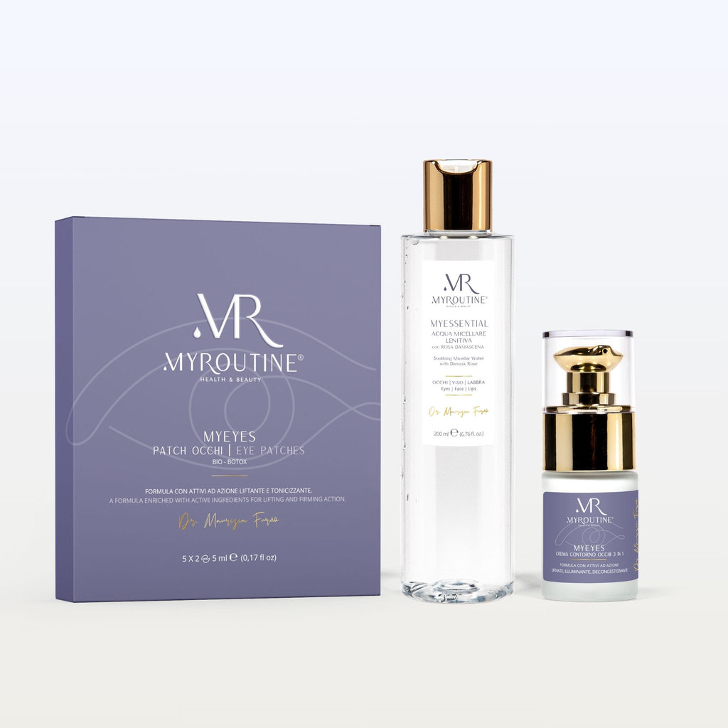 MyEssential Acqua micellare strucca delicatamente in un solo gesto, BioBotox Eye Patch levigano e decongestionano, Eye Cream 3in1 idrata quotidianamente, ridu...